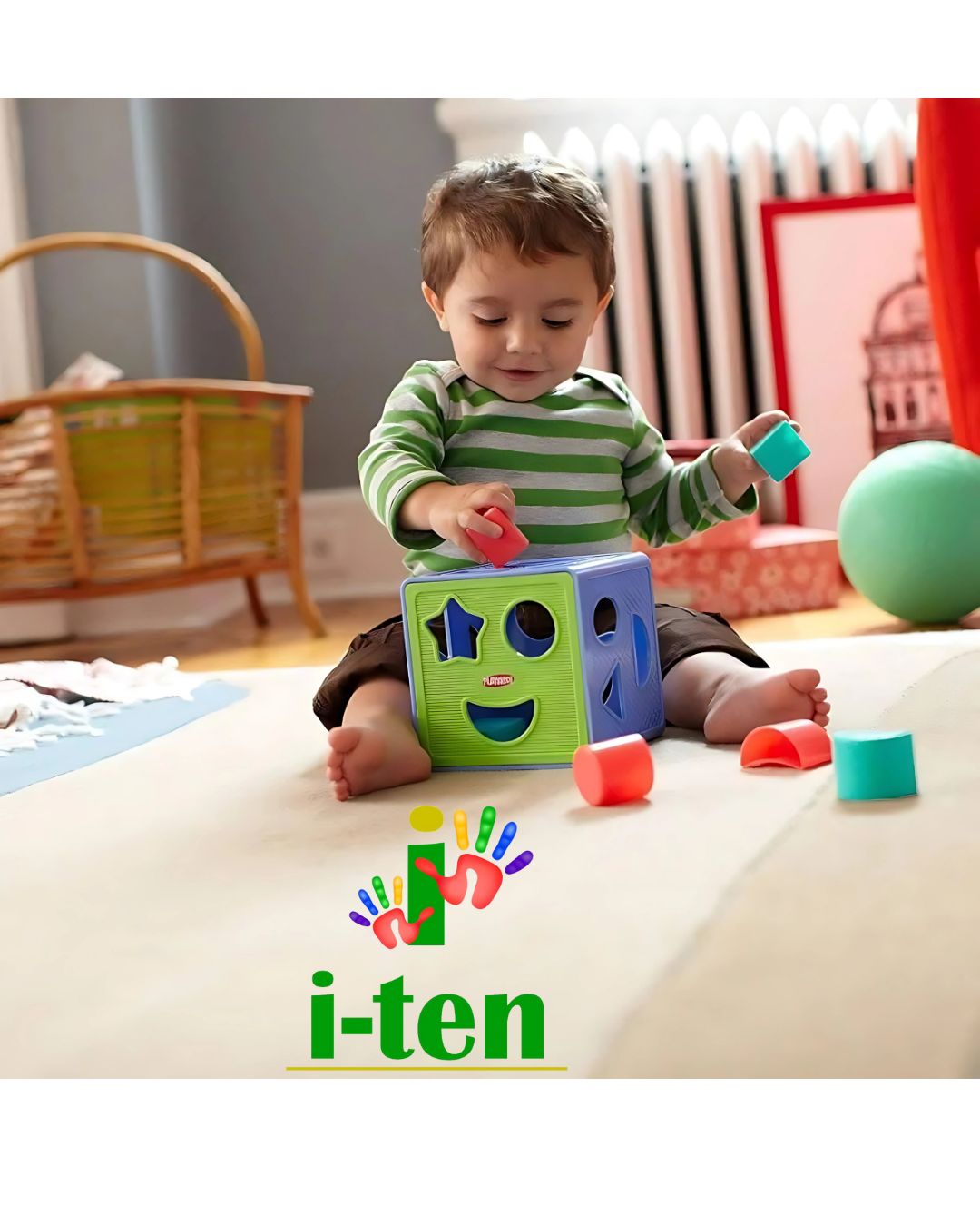 The child tries to insert each geometric shape into the matching hole on the box. Through repeated play, the child learns to associate shapes with their corresponding spaces, improving visual perception and focus.